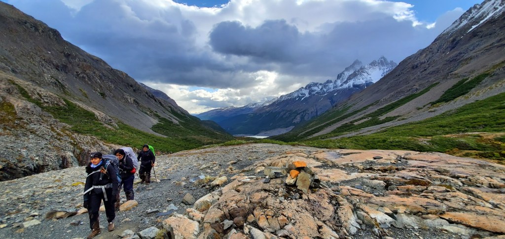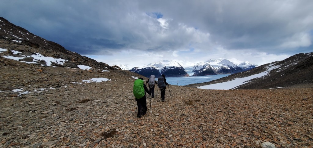 Every blog we’d read had advised that the descent from the pass was the harder part of the journey. We’d fooled ourselves into believing that cresting John Gardner would mean we were assured a passage to Refugio Grey that day. As we started our climb down, the horrors of the trail came back, but seemingly in reverse. The rough rocky patches came first. They forced us to step down from higher-than-knee level stones to get to the next level. We frequently sat down and eased our selves off of a rock to find our next step. Not technical, perhaps without a backpack and tired limbs something we might risk a skip down, but under the conditions, each presented itself as puzzle. Rats in a maze gardens. Was there a cut in the rock to get a ginger foot hold? Would the other rock seemingly just a step lower, but just far enough away be reachable, if we stretched our foot out? Mostly, the conclusion was let’s sit this one down and lower ourselves to the next level. We imagined Denny and Benny cheerfully skipping down this. It didn’t help.