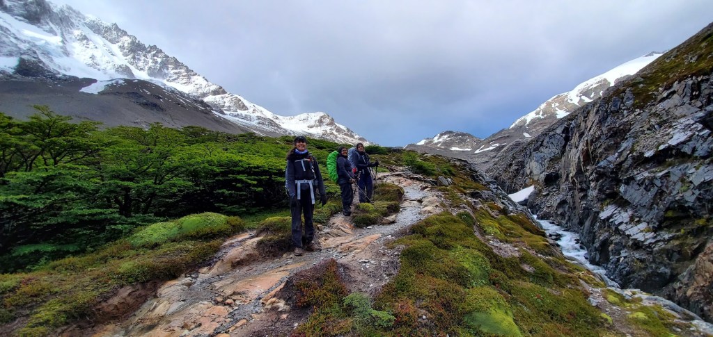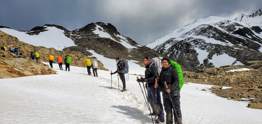 We hit the pass at 11 a.m. It had been 7 hours since we’d started and apart from small water breaks, we had moved constantly. At camps, we had become friends with two young Americans – Denny and Benny, who had been backpacking through South America for while. They had started at 6 a.m and had crossed us about 30 minutes ago, but it didn’t matter. We knew we still had a long trail ahead till Refugio Grey, but 11 a.m seemed like a good time to have hit the milestone of John Gardner. Along the way, we had crossed rooty undergrowth’s, flooded sections, snow clad slopes, rocky jagged inclines that had required the use of all 4 of our limbs, but here we were.