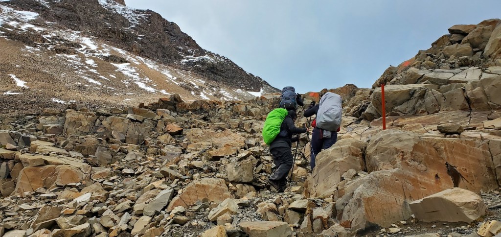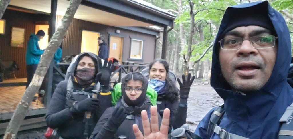 Starting Day-4, we knew we had a hard hike ahead of us. We had slept dry and slept soundly, but it had rained all night at Perros and when we broke camp and gathered in the camp kitchen to make a quick coffee before embarking, it was still raining. There was a grey fog, and not just the ground, or the mossy wet underbrush – soggy and oozing water, but even tree trunks seemed to have turned a dark, deep, shiny dripping brown with the rain. We sloshed into muck, taking our first steps towards John Gardner pass. It was just past 4 a.m. in the morning.