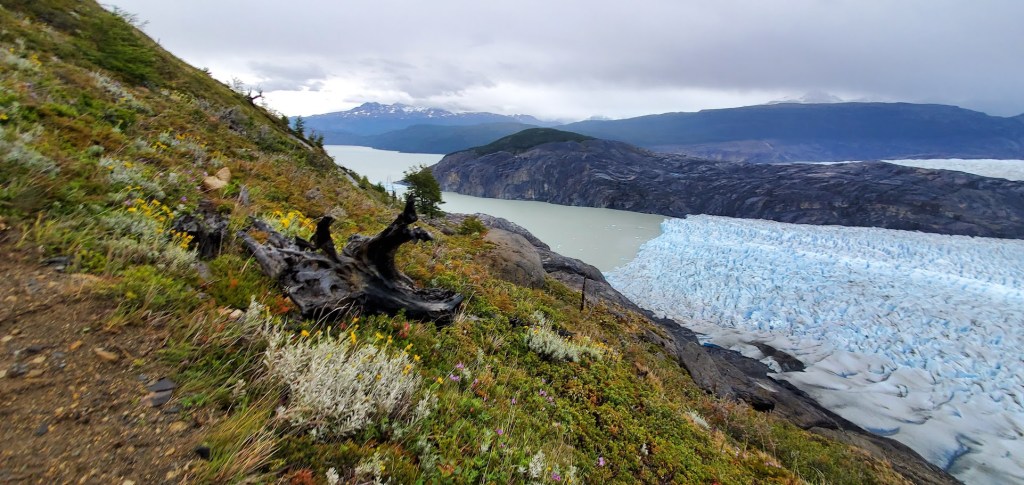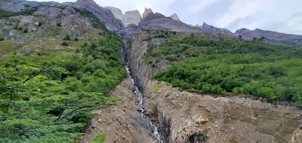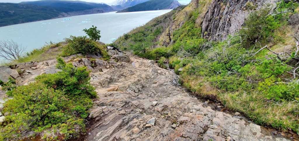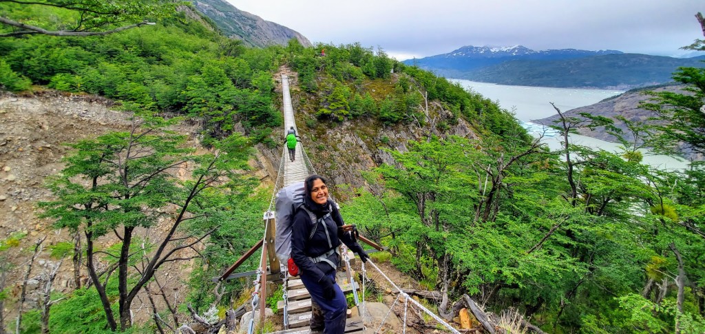 We started our trek by 4:30 a.m. hoping to cover the 5 miles in 5 hours. Dawn breaks early in the Patagonian summer and we had full daylight before 5 a.m. The trail here was better maintained, because the O circuit had started to merge onto the W. While the W terminated at Grey, people staying there would often do a day-hike up the trail to Paso to get the more scenic views of Glacier Grey. Along the way were also 3 hanging bridges. Strung on steel cables, these bridges were a highlight that Baba and I were looking forward to. Shubhi was indifferent and I knew Mumma was dreading those crossings. A couple of miles into the trail we encountered the first bridge. It lay over a deep gorge – 200? ft. deep with a raging river running at the bottom that emptied into Lago Grey. Walking the span is surreal. On one side there is a steep mountain that has a gash down its face, that a river comes crashing down and on the other the open expanse of Glacier Grey meeting Lago Grey. In the clash of water (Lago Grey) and ice (Glacier Grey), from that vantage point of the bridge it looks like the ice is winning, but as we learnt later, like most major glaciers across the Earth, the warming Earth is handicapping the ice. Unfortunately, Glacier Grey is losing the fight to Lago Grey.